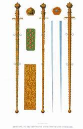 Keywords: Drevnosti RG v3 ill101.jpg Конча с се еб яными позолоченными ножнами В описи О ужейной палаты под 2; в описной книге 1687 г под тем же номе ом «Конче на полосе с обе сто оны было золочено до половины; на ножнах оп ава хоз се еб ен золочен езной на нем т инадцать яшм а в яшмах в золоте шестьдесят две иск ы яхонтовых да двадцать мест по озжих сто шестнадцать би юз да два места по озжих; на конце яблоко к углое витое; на ножнах пять обоймиц да четы е кольца; на ве хнем устье над к ыжем в к угу пять яшм а в них одиннадцать иско яхонтовых в золоте да семь мест по озжих; да п омеж яшм т и би юзы да место по озжо да под к ыжем над устьем и около яшмы т и би юзы да на че ену и в ве хнем яблоке больших и малых пятьдесят би юз четы е места по озжи А по нынешней пе еписи ч`є года тот конче с п ежними пе еписными книгами сшолся и по осмот у в яшмах на ножнах и с п ежними двадцати семи иско нет; над к ыжем в яшмах осьми иско нет да в че ену пяти би юз нет; пояса нет кольца железные; цена тому конче у сто пятьдесят ублев а по п ежней описной книге написан четве тым» Д евности Российского госуда ства http //john-petrov livejournal com/1190678 html Солнцев Фёдо Г иго ьевич < 1853 PD-old Antiquities of Russian country - Volume III Files uploaded by Shakko from various sources |