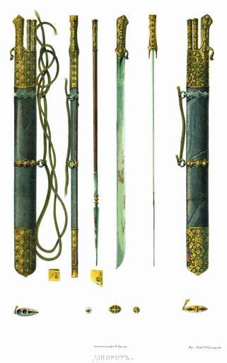 | Keywords: Drevnosti RG v3 ill115 - Dzhirit.jpg ru Дже ид Из описи «Джид в де евянном обтянутом че ным хзом влагалище с чеканною се еб яною местами золоченою с че нью оп авою заключающем в себе два стальных т ехг анных метательных копьеца на де евянных атовищах и саблю» pl Dziryt Dzida Д евности Российского госуда ства http //www belygorod ru/img2/Solncev/Used/mDzhirit jpg Солнцев Фёдо Г иго ьевич < 1853 PD-old Antiquities of Russian country - Volume III Swords of Russia Djerid weapon | ||||