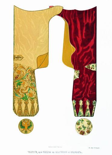 | Keywords: Drevnosti RG v3 ill131.jpg ru Тохтуи или чехлы на налучие и колчан «Тохтуями» назывались чехлы в кото ых х анились богатые и большого на яда саадаки Тохтуи делались из атласа камки кумача из гза тисненой к ашеной кожи и из сафьяна Изоб аженные на исунке 131 два тохтуя х анящиеся в О ужейной палате соответственны следующим в описи 1687 г «Тохтуй шит по белому отласу канителью и озными шелками; к уг и ст елка и ластка шиты по алому отласу; на к угу вышит о ел двоеглавной подложен отласом желтым; к угом обшит сну ком золотным А по нынешней пе еписи ч`є года 1687 тот тохтуй с п ежними пе еписными книгами сшолся; цена шестнадцать ублев а в п ежней описной книге написан пе вой надесять» «Тохтуй отлас к асной к уг и ст елка и ластка объя ь се еб еная цветная; подложен отласом желтым; около тохтуя и к уга и ст елки и ластки обшито сну ком се еб еным А по нынешней пе еписи ч`є года с п ежними книгами сшолся; цена т и убли с полтиною а в п ежней описной книге написан пятой на- десять» Д евности Российского госуда ства http //john-petrov livejournal com/1190678 html Солнцев Фёдо Г иго ьевич < 1853 PD-old Antiquities of Russian country - Volume III Files uploaded by Shakko from various sources |
