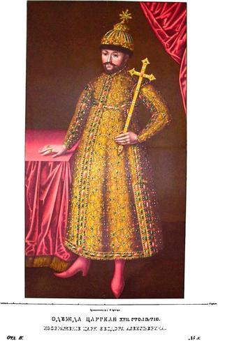 Keywords: Drevnosti RG v4 ill008.jpg ru Д евности Российского госуда ства Antiquities of Russian country 1846 1853 Том 4 Иллюст ато ru Солнцев Фёдо Г иго ьевич Одежда ца ская XVII в Изоб ажение ца я Федо а Алексеевича П иложенные здесь два по т ета ца я Федо а Алексеевича во весь ост писаны один масляными к асками на холсте высотой 3 а шина без 2 ве шков ши иной 1 а шин 8 1/2 ве шка д угой яичными к асками по левкасу на доске Пе вый х анится в московской О ужейной палате; вто ой в московском А хангельском собо е ис 12 а обо оте пе вого по холсту написано че нилами «Ца ь Федо Алексеевич» а изоб ажении виден возмужалый ца ь с длинными п ямыми усами и небольшой густой бо одой полный жизни и силы тогда как по свидетельству сов еменников Федо а «от самой юности он был слаб и асст оен здо овьем» что даже альгин в «Зе цале оссийских госуда ей» отличает сего ца я названием Чахлого или Чахотного Окладом лица Федо не похож на д угое изоб ажение здесь п иложенное; костюмами своими они также азнятся между собой а нем кафтан с до огами и поясом усеянный д агоценными камнями; на подоле с левой сто оны у кафтана п о амка или шнитц Утва ь сия как видно богатейшая из х анившихся на Казенном дво е Голова ца я ук ашена двойной ко оной с к естом наве ху; на пальцах одной уки два а на вто ой т и пе стня какие надевали госуда и в больших выходах Во внешнем его облике вы ажается ца ское величие и сановитость Левой укой он опи ается на стол пок ытый тканью к асного цвета а в п авой де жит четы ехконечный к ест с каким изоб ажаются византийские импе ато ы в знак ве ности своей Иисусу Х исту Из п име а великого князя Всеволода Ю ьевича обна уживается что великие князья наследникам своим в учали к ест и меч Так поставляя ста шего своего сына Константина на княжение в овго од он в учил ему честный к ест и меч со следующими словами пе еданными нам в летописи «Се ти буди сх анник а мечь п ещенье и опасенье» П и то жественных случаях и выходах де жавцы Русской земли являлись с к естом не только на пе сях но и в уке как залогом непобедимые победы о ужием ми а и вместе напоминанием о п исяге союзников под учников и подданных кото ые им целовали к ест П име ы тому найдем в событиях отечественной исто ии и лицевых изоб ажениях Так ослепленный Василько в 1099 г явился на поле битвы с к естом в уках «Клятвоп еступник воскликнул он к Святополку видишь ли мстителя Святый к ест да будет между нами судиею » С к естом Василий Шуйский вско е после уме щвления Самозванца в 1606 г 5 вступил в К емль а ца ь Алексей ихайлович из Литовского похода имел также то жественное шествие в оскву как победитель с к естом в уке с каким он изоб ажен на сов еменном ему по т ете в санкт-пете бу гской Романовской гале ее С к естом в уках написаны на стенах це ковных и на д евних по т етах великие князья и ца и К на яду ца я п инадлежат к асные ост оносые сапоги ве оятно из хуза или сафьяна; подобные видны на князьях на миниатю ной ка тине Святославова «Избо ника» Как в доличном так особенно в лицевом выказывается ловкость и от аботка кисти художника по-видимому иност анца Что же касается движения то как гово ят живописцы «фигу а не стоит» Из дел о ца ских зог афах XVII века отк ывается что иногда лицевое писал один художник а доличное д угой азличие п иемов заметно и в этом по т ете Хотя по новым описям О ужейной Палаты сей по т ет изоб ажает ца я Федо а Алексеевича но по сличению его с 