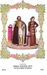 | Keywords: Drevnosti RG v4 ill014.jpg ru Д евности Российского госуда ства Antiquities of Russian country 1846 1853 Том 4 Иллюст ато ru Солнцев Фёдо Г иго ьевич Одежда боя ская XVII в По т еты князей Репниных Здесь видим снимки с подлинных по т етов князей Репниных боя ина Бо иса Александ овича и Пет а Александ овича воеводы овго одского в их на яде Академик Солнцев заимствовал изоб ажение их костюма из Олеа иева «Путешествия» а боя ине зипун застегнутый пуговицами; на поясе сабля Све х исподницы надеты желтые сапоги у колен подвязанные Све х зипуна шуба ту ецкая с отложным во отником с золотыми петлицами и откидными укавами Д угой в кафтане с петлицами и п о ехой или аз езом на поле В одной уке у него шапка в д угой ши инка Хотя на исунке в «Исто ическом описании одежды и воо ужения Российских войск» ис 10 этот кафтан назван охобнем но последний был ши е и длиннее пе вого имел п о ехи под укавами и четы ехугольный откидной во отник В ца ствование Федо а Алексеевича восп ещено было в охобнях впускать во дво ец и даже в К емль Кафтан составлял упот ебительнейшую одежду в допет овской России «Знатные» по словам Ка лейля «носят кафтаны кои п ости аются до колен и застегиваются напе еди пуговицами с петлицами» Сзади кафтана п истегивался высокий стоячий во отник известный под именем козы я кото ый не едко ук ашался золотым и се еб яным шитьем по ба хату и алтасу жемчугом и до огими каменьями; отсюда и на одное вы ажение «ходить козы ем» т е важничать щеголять Как фе ези так и кафтаны были азных одов по их назначению и п оисхождению ве хние и исподние становые и ездовые сми ные или т ау ные и дождевые ту ские есские кизылбашские и че кесские усского пок оя а сию одежду упот еблялись ткани из шелка и бумаги также сукна 1846 1853 http //www runiverse ru/ Солнцев Фёдо Г иго ьевич PD-Art Antiquities of Russian country - Volume IV Russian boyars Files uploaded by Shakko from various sources Uploaded with UploadWizard Parsuna portraits of Repnin brothers |