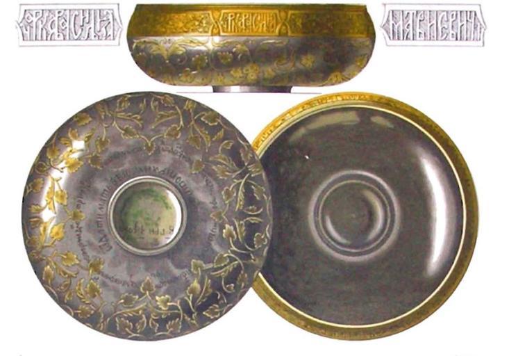 Keywords: Drevnosti RG v5 ill 008a.jpg ru Д евности Российского госуда ства Antiquities of Russian country 1846 1853 Иллюст ато ru Солнцев Фёдо Г иго ьевич Б атина Василия атвеевича До оканова Ча ка Василия атвеевича До оканова поступила в О ужейную палату в 1730 году Вок уг над поддоном д угая надпись ча ка конюшего в 1600 году и боя ина Дмит ия Ивановича Годунова дяди Бо иса ; дал в дом Живоначальной Т оице в Ипацкой монасты ь иже отдати атвею ихайловичу Годунову Ча ка Ца я ихаила Феодо овича 1846 1853 Руниве с ru Солнцев Фёдо Г иго ьевич other versions PD-old-70-1923 Files uploaded by Shakko from various sources Antiquities of Russian country - Volume V Bratina Dmitriy Ivanovich Godunov