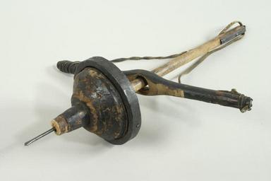 Keywords: Drillborr för vapen - Livrustkammaren - 13959.jpg Drillborr i form av en 525 mm lång rund trästav med hål i ena änden för borrstål l 55 mm runt tvärsnitt med breddad och tillplattad ände och v-formig ände med snedställda skär Skaftets del ovanför borrstålet något konisk största d upptill 37 mm Därovanför 55 mm från skaftänden en på undersidan profilerad ca 60 mm hög centrifugalskiva av trä med kanten skodd med kraftig stålring <br/><br/>Skaftet därovanför d 20 mm överänden försedd med ett två gånger om skaftet nitat stålband över änden med öppning för läderrem <br/><br/>På skaftet trätt en tvärslå med ansvällning på mitten med hål för skaftet På tvärslåns ändar fastknuteten läderrem som går upp genom lindningen i andra änden enbart fastknuten <br/><br/>För att få borren i rotation lindas läderremmen runt skaftet och när tvärslån trycks neråt bringas borren i rotation original caption Drillborr för vapen - LRK 24365 ca 1900 wood - steel g 1630 size mm 155 skiva size mm 420 size mm 590 LRK place of origin original filename lm_dig1625 60909 inventory number LRK 24365 13959 CC-BY-SA Samuel Uhrdin <gallery caption Different images of same object > File Drillborr av stål och trä ca 1900 - Livrustkammaren - 5398 jpg </gallery> Samuel Uhrdin Media contributed by LSH dim-with multiple size templates Media contributed by LSH unmatched creator Media contributed by LSH unmatched objKeyword Hand-powered drills Color images from Livrustkammaren Media contributed by LSH 2013-10 |