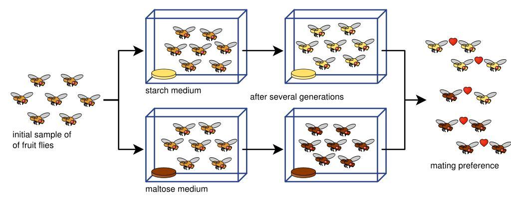 | Keywords: Drosophila speciation experiment.svg  An experiment demonstrating allopatric speciation in the fruit fly Drosophila pseudoobscura conducted by Diane Dodd A single population of flies was divided into two with one of the populations fed with starch-based food and the other with maltose-based food After the populations had diverged over many generations the groups were again mixed; it was observed that the flies continued to prefer mating with others from the same original population Edited in Inkscape by User Fastfission based on versions by User BenB4 Image Speciation experiment svg from Ilmari Karonen's Image Drosophila speciation svg based on http //evolution berkeley edu/evolibrary/images/evo/drosophila_experiment gif from http //evolution berkeley edu/evolibrary/article/0_0_0/evo_45 2006-08-20 own assumed Fastfission~commonswiki Created with Inkscape Speciation Drosophila pseudoobscura SVG evolution |