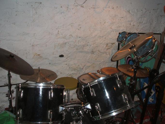 Keywords: Drums un cellar.JPG en drum kit including african drum china cymbal trash hit cymbal bass drum abd toms hi hats snare and rototoms Own Hairfarmer Drum-kits