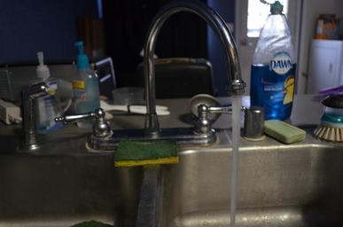 Keywords: dish dishes water clean chore soap sink spray dirty cleaning housekeeping