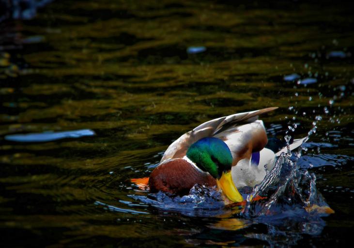 Keywords: duck bird water splash beak nature wildlife lake wild animal feather blue swim color pond mallard green wing waterfowl outdoors ripple wave