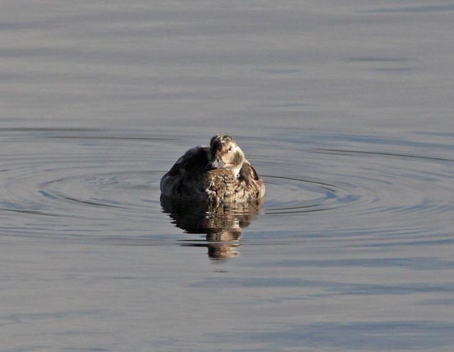 Keywords: outdoor animal When first posted I had thought that this bird was an adult male. Doing more research, I now feel that it was a HY male in "supplemental 1" plumage or there-about. Primary reason being the amount of brown in the face and flanks and breast. I think that in an adult male in molt that the mix would be black and white, not brown and white. And although the bill of an adult male might be all gray at this time of year, I think that this is more likely of an imm bird. The following is copied from NA Birds: "Alternate I Plumage Prealternate I molt begins in Oct and continues to mid-Dec. Timing known only for male, assumed to be similar for female (Palmer 1976). Partial molt; Juvenal wing and Basic I tail and belly retained. Male. A less well-defined version of Definitive Alternate male plumage. Gray patch around eye more brown and less well defined, loral-patch dark brown (not black). Breast has smaller and less crisp black band than in Definitive Alternate. Back a mixture of black and white feathers; scapulars gray to white. Sides and flanks light gray, belly white." Robertson, Gregory J. and Jean-Pierre L. Savard. 2002. Long-tailed Duck (Clangula hyemalis), The Birds of North America Online (A. Poole, Ed.). Ithaca: Cornell Lab of Ornithology; Retrieved from the Birds of North America Online: bna.birds.cornell.edu/bna/species/651 doi:10.2173/bna.651 When first posted I had thought that this bird was an adult male. Doing more research, I now feel that it was a HY male in "supplemental 1" plumage or there-about. Primary reason being the amount of brown in the face and flanks and breast. I think that in an adult male in molt that the mix would be black and white, not brown and white. And although the bill of an adult male might be all gray at this time of year, I think that this is more likely of an imm bird. The following is copied from NA Birds: "Alternate I Plumage Prealternate I molt begins in Oct and continues to mid-Dec. Timing known only for male, assumed to be similar for female (Palmer 1976). Partial molt; Juvenal wing and Basic I tail and belly retained. Male. A less well-defined version of Definitive Alternate male plumage. Gray patch around eye more brown and less well defined, loral-patch dark brown (not black). Breast has smaller and less crisp black band than in Definitive Alternate. Back a mixture of black and white feathers; scapulars gray to white. Sides and flanks light gray, belly white." Robertson, Gregory J. and Jean-Pierre L. Savard. 2002. Long-tailed Duck (Clangula hyemalis), The Birds of North America Online (A. Poole, Ed.). Ithaca: Cornell Lab of Ornithology; Retrieved from the Birds of North America Online: bna.birds.cornell.edu/bna/species/651 doi:10.2173/bna.651