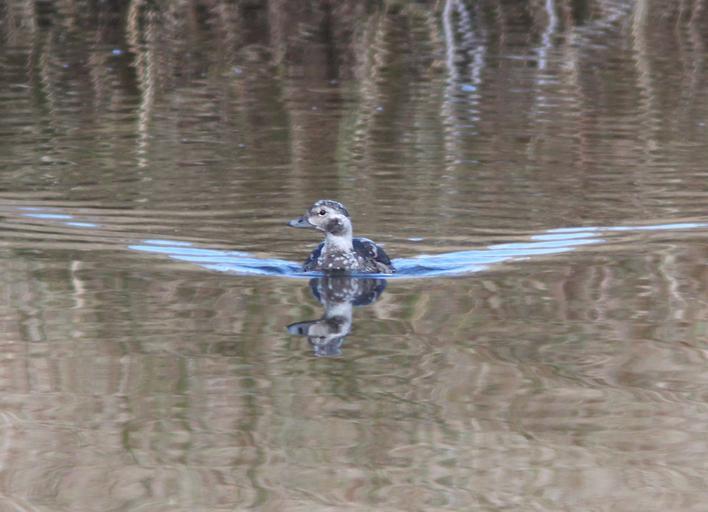 | Keywords: outdoor When first posted I had thought that this bird was an adult male. Doing more research, I now feel that it was a HY male in "supplemental 1" plumage or there-about. Primary reason being the amount of brown in the face and flanks and breast. I think that in an adult male in molt that the mix would be black and white, not brown and white. And although the bill of an adult male might be all gray at this time of year, I think that this is more likely of an imm bird. The following is copied from NA Birds: "Alternate I Plumage Prealternate I molt begins in Oct and continues to mid-Dec. Timing known only for male, assumed to be similar for female (Palmer 1976). Partial molt; Juvenal wing and Basic I tail and belly retained. Male. A less well-defined version of Definitive Alternate male plumage. Gray patch around eye more brown and less well defined, loral-patch dark brown (not black). Breast has smaller and less crisp black band than in Definitive Alternate. Back a mixture of black and white feathers; scapulars gray to white. Sides and flanks light gray, belly white." Robertson, Gregory J. and Jean-Pierre L. Savard. 2002. Long-tailed Duck (Clangula hyemalis), The Birds of North America Online (A. Poole, Ed.). Ithaca: Cornell Lab of Ornithology; Retrieved from the Birds of North America Online: bna.birds.cornell.edu/bna/species/651 doi:10.2173/bna.651 When first posted I had thought that this bird was an adult male. Doing more research, I now feel that it was a HY male in "supplemental 1" plumage or there-about. Primary reason being the amount of brown in the face and flanks and breast. I think that in an adult male in molt that the mix would be black and white, not brown and white. And although the bill of an adult male might be all gray at this time of year, I think that this is more likely of an imm bird. The following is copied from NA Birds: "Alternate I Plumage Prealternate I molt begins in Oct and continues to mid-Dec. Timing known only for male, assumed to be similar for female (Palmer 1976). Partial molt; Juvenal wing and Basic I tail and belly retained. Male. A less well-defined version of Definitive Alternate male plumage. Gray patch around eye more brown and less well defined, loral-patch dark brown (not black). Breast has smaller and less crisp black band than in Definitive Alternate. Back a mixture of black and white feathers; scapulars gray to white. Sides and flanks light gray, belly white." Robertson, Gregory J. and Jean-Pierre L. Savard. 2002. Long-tailed Duck (Clangula hyemalis), The Birds of North America Online (A. Poole, Ed.). Ithaca: Cornell Lab of Ornithology; Retrieved from the Birds of North America Online: bna.birds.cornell.edu/bna/species/651 doi:10.2173/bna.651 |
