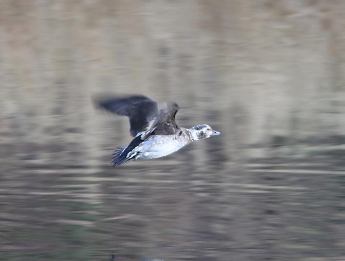 Keywords: outdoor animal When first posted I had thought that this bird was an adult male. Doing more research, I now feel that it was a HY male in "supplemental 1" plumage or there-about. Primary reason being the amount of brown in the face and flanks and breast. I think that in an adult male in molt that the mix would be black and white, not brown and white. And although the bill of an adult male might be all gray at this time of year, I think that this is more likely of an imm bird. The following is copied from NA Birds: "Alternate I Plumage Prealternate I molt begins in Oct and continues to mid-Dec. Timing known only for male, assumed to be similar for female (Palmer 1976). Partial molt; Juvenal wing and Basic I tail and belly retained. Male. A less well-defined version of Definitive Alternate male plumage. Gray patch around eye more brown and less well defined, loral-patch dark brown (not black). Breast has smaller and less crisp black band than in Definitive Alternate. Back a mixture of black and white feathers; scapulars gray to white. Sides and flanks light gray, belly white." Robertson, Gregory J. and Jean-Pierre L. Savard. 2002. Long-tailed Duck (Clangula hyemalis), The Birds of North America Online (A. Poole, Ed.). Ithaca: Cornell Lab of Ornithology; Retrieved from the Birds of North America Online: bna.birds.cornell.edu/bna/species/651 doi:10.2173/bna.651 When first posted I had thought that this bird was an adult male. Doing more research, I now feel that it was a HY male in "supplemental 1" plumage or there-about. Primary reason being the amount of brown in the face and flanks and breast. I think that in an adult male in molt that the mix would be black and white, not brown and white. And although the bill of an adult male might be all gray at this time of year, I think that this is more likely of an imm bird. The following is copied from NA Birds: "Alternate I Plumage Prealternate I molt begins in Oct and continues to mid-Dec. Timing known only for male, assumed to be similar for female (Palmer 1976). Partial molt; Juvenal wing and Basic I tail and belly retained. Male. A less well-defined version of Definitive Alternate male plumage. Gray patch around eye more brown and less well defined, loral-patch dark brown (not black). Breast has smaller and less crisp black band than in Definitive Alternate. Back a mixture of black and white feathers; scapulars gray to white. Sides and flanks light gray, belly white." Robertson, Gregory J. and Jean-Pierre L. Savard. 2002. Long-tailed Duck (Clangula hyemalis), The Birds of North America Online (A. Poole, Ed.). Ithaca: Cornell Lab of Ornithology; Retrieved from the Birds of North America Online: bna.birds.cornell.edu/bna/species/651 doi:10.2173/bna.651