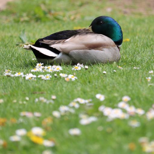 Keywords: duck mallard grass flowers bird waterfowl male sleeping