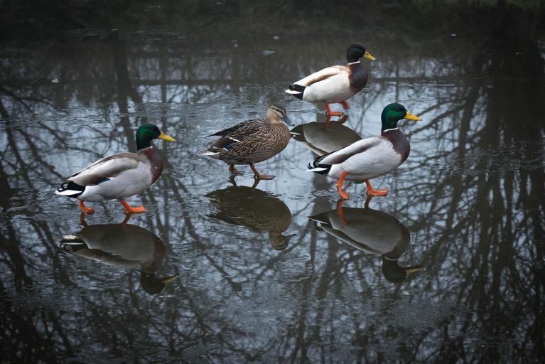 Keywords: ducks mallards wildlife animal bird waterbird lake pond water reflection flock nature wild feather walking ornithology