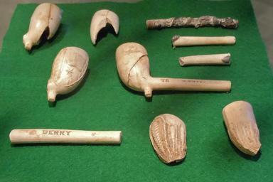 | Keywords: Duffys Cut Pipes 1.jpg en Smoking pipe fragments excavated at Duffy's Cut Pennsylvania Some of the pipes clearly made in Ireland Museum location given 2011-04-15 own Smallbones 40 1 44 N 75 34 18 W cc-zero Uploaded with UploadWizard Duffy's Cut |