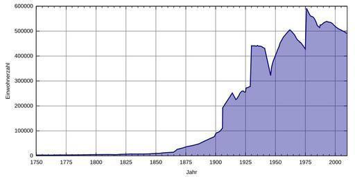 Keywords: Duisburg population.svg en Duisburg population statistics since 1750 de Einwohnerentwicklung von Duisburg seit 1750 own ; data from de Einwohnerentwicklung_von_Duisburg Gorgo 2011-03-10 File Duisburg population sv svg Created with Gnuplot /usr/bin/gnuplot gnuplot 4 2 / Ubuntu 8 10 input set timefmt d m Y set datafile separator ; output unset key set style data lines set style fill transparent solid 0 4 set grid set xdata time set xlabel 'Jahr' set xrange '01 01 1750' '31 12 2009' set xtics 788400000 set mxtics 5 set format x ' Y' set ylabel 'Einwohnerzahl' set ytics 100000 set format y ' 0f' set term svg size 800 400 font Arial 10 set output 'duisburg_population svg' plot '-' using 1 2 with filledcurves below x1 lt rgb 'dark-blue' lw 2 30 06 1714;2983 30 06 1722;2935 30 06 1740;2793 30 06 1756;2874 30 06 1763;2678 30 06 1767;3227 30 06 1770;3134 30 06 1777;3342 30 06 1784;3531 30 06 1787;3657 30 06 1798;4530 30 06 1810;5195 01 12 1816;4508 01 12 1818;5364 01 12 1820;5936 01 12 1825;6408 01 12 1828;7058 01 12 1831;7005 03 12 1840;7021 03 12 1843;7506 03 12 1846;8543 03 12 1849;8948 03 12 1852;9579 03 12 1855;11629 03 12 1858;12674 03 12 1861;13422 03 12 1864;14368 03 12 1867;25757 01 12 1871;30533 01 12 1875;36580 01 12 1880;41249 01 12 1885;47519 01 12 1890;59285 02 12 1895;70272 31 12 1896;72460 31 12 1897;74780 31 12 1898;77090 31 12 1899;87510 01 12 1900;92729 31 12 1901;93320 31 12 1902;96620 31 12 1903;100050 31 12 1904;106770 30 09 1905;110317 01 12 1905;192346 31 12 1906;200392 31 12 1907;207819 31 12 1908;215246 31 12 1909;222673 01 12 1910;229483 31 12 1911;237129 31 12 1912;245021 31 12 1913;251750 01 12 1916;225545 05 12 1917;229584 08 10 1919;244302 31 12 1919;248225 31 12 1920;254887 31 12 1921;259314 31 12 1922;260169 31 12 1923;255677 31 12 1924;255799 16 06 1925;272252 31 12 1925;272736 31 12 1926;273492 31 12 1927;276495 31 12 1928;277671 31 12 1929;441389 31 12 1930;441158 31 12 1931;441107 31 12 1932;441139 16 06 1933;440419 31 12 1933;439483 31 12 1934;442513 31 12 1935;439627 31 12 1936;440100 31 12 1937;438861 31 12 1938;436800 17 05 1939;434646 31 12 1940;431300 31 12 1945;322301 29 10 1946;356408 31 12 1947;378289 13 09 1950;410783 31 12 1951;426853 31 12 1952;437616 31 12 1953;453311 25 09 1956;476523 06 06 1961;502993 31 12 1961;504975 31 12 1962;501616 31 12 1963;496354 31 12 1964;490374 31 12 1965;484930 31 12 1966;475858 31 12 1967;467780 31 12 1968;462572 31 12 1969;458916 27 05 1970;454839 31 12 1970;454885 31 12 1971;448791 31 12 1972;442386 31 12 1973;435281 31 12 1974;428594 31 12 1975;591635 31 12 1976;581971 31 12 1977;572101 31 12 1978;563088 31 12 1979;559066 31 12 1980;558089 31 12 1981;554377 31 12 1982;546566 31 12 1983;536402 31 12 1984;522829 31 12 1985;518260 31 12 1986;514628 25 05 1987;525378 31 12 1987;524502 31 12 1988;527447 31 12 1989;532152 31 12 1990;535447 31 12 1991;537441 31 12 1992;539094 31 12 1993;536797 31 12 1994;536106 31 12 1995;535250 31 12 1996;532701 31 12 1997;529062 31 12 1998;523311 31 12 1999;519793 31 12 2000;514915 31 12 2001;512030 31 12 2002;508664 31 12 2003;506496 31 12 2004;504403 31 12 2005;501564 31 12 2006;499111 31 12 2007;496665 31 12 2008;492870 31 12 2009;491931 e Cc-zero Temporal population graphs of North Rhine-Westphalia Statistics of Duisburg |