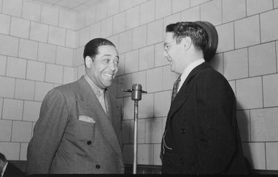Keywords: Duke Ellington, William P. Gottlieb ca. 1942.jpg en Duke Ellington with the photographer William P Gottlieb Winx radio Washington ca 1942 fr Duke Ellington et le photographe William P Gottlieb à la radio Winx Wahington autour de 1942 http //lcweb2 loc gov/diglib/ihas/loc natlib gottlieb 02521/enlarge html page 1 section ver01 Delia Potofsky Gottlieb 1942 PD-Gottlieb Black and white photographs of the United States in the 1940s |