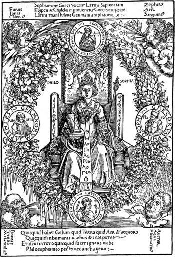 | Keywords: Dürer, Philosophia.png Boëthius ™ Consolation of Philosophy Four famous wise men Plato Ptolemy Cicero or Virgil Albertus Magnus represent Greek philosophers Egyptian priests Roman poets and orators German wise men In the corners the four personificated winds stay for the four cardinal points elements and temperaments associated with them Boëthius ™ Trost der Philosophie Vier berühmte Weise Platon Ptolemaios Cicero oder Vergil Albertus Magnus stehen für žGriechische Philosophen žÃ„gyptische Priester žRömische Dichter und Redner žDeutsche Weise In den Ecken stehen die vier personifizierten Winde für die mit ihnen assoziierten vier Himmelsrichtungen Elemente und Temperamente Scanned from Albrecht Dürer 1471 bis 1528 Das gesamte graphische Werk mit einer Einleitung von Wolfgang Hütt Band 2 Druckgraphik München Rogner und Bernhard 1971 page 1437 Creator Albrecht Dürer 1502 PD-old-100 Woodcuts by Albrecht Dürer 1501-1510 Allegories of philosophy Consolation of Philosophy Plato Ptolemy Virgil Cicero Albertus Magnus 1502 works in Germany |