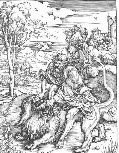 | Keywords: Dürer - Samsoms Kampf mit dem Löwen.jpg en Samsoms fight against the lion de Samsoms Kampf mit dem Löwen repro from art book Creator Albrecht Dürer 1471-05-21; 1528-04-06 Author died more than 70 years ago - public domain PD-old-100 Woodcuts by Albrecht Dürer 1489-1500 |