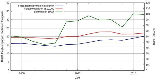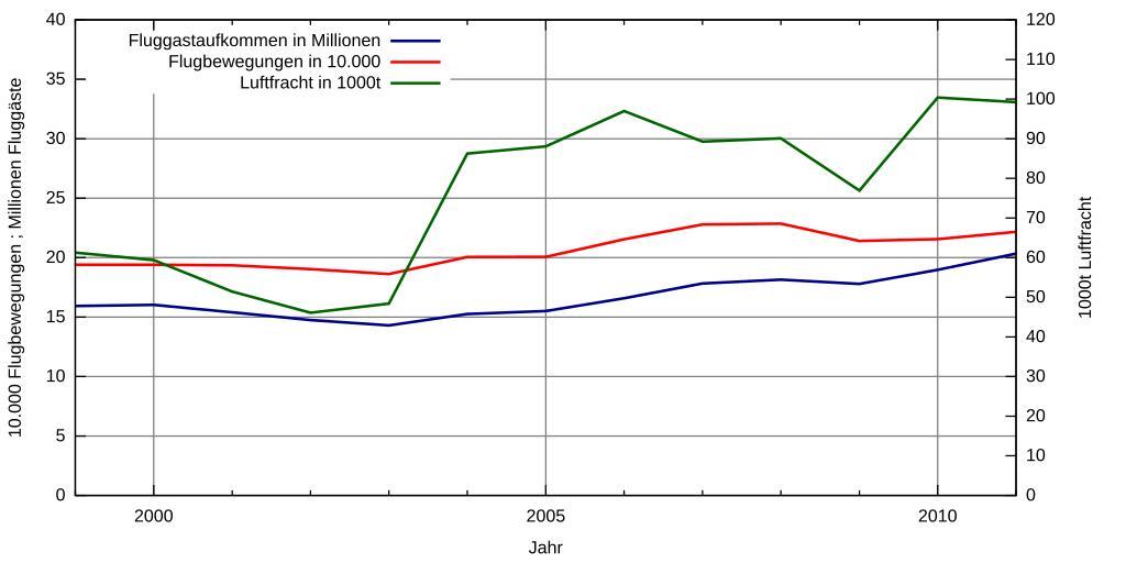 Keywords: DUS stats.svg en Düsseldorf International Airport statistical data de Flughafen Düsseldorf International Verkehrszahlen seit 1999 own ; data from http //www duesseldorf-international de/dus/daten_zahlen/ duesseldorf-international de Gorgo 2011-02-13 Cc-zero Created with Gnuplot /usr/bin/gnuplot gnuplot 4 2 / Ubuntu 8 10 input set timefmt Y set datafile separator ; output set key top left set style data lines set grid set xdata time set xlabel 'Jahr' set xrange '1999' '2011' set xtics 157680000 set mxtics 5 set format x ' Y' set ylabel '10 000 Flugbewegungen ; Millionen Fluggäste' set ytics nomirror set ytics 5 set yrange 0 40 set y2tics 10 set autoscale y2 set y2range 0 120 set y2label '1000t Luftfracht' set term svg size 800 400 font Arial 10 set output 'DUS_stats svg' plot '-' using 1 2 title 'Fluggastaufkommen in Millionen' axes x1y1 lt rgb 'dark-blue' lw 2 \ '-' using 1 2/10000 title 'Flugbewegungen in 10 000' axes x1y1 lt rgb 'red' lw 2 \ '-' using 1 2/1000 title 'Luftfracht in 1000t' axes x1y2 lt rgb 'dark-green' lw 2 1999;15 93 2000;16 03 2001;15 40 2002;14 75 2003;14 30 2004;15 26 2005;15 51 2006;16 59 2007;17 83 2008;18 15 2009;17 79 2010;18 98 2011;20 34 e 1999;194065 2000;194016 2001;193514 2002;190300 2003;186159 2004;200584 2005;200619 2006;215481 2007;227899 2008;228531 2009;214024 2010;215554 2011;221671 e 1999;61264 2000;59361 2001;51441 2002;46085 2003;48419 2004;86267 2005;88058 2006;97000 2007;89281 2008;90100 2009;76916 2010;100398 2011;99220 e Düsseldorf Airport Airport statistics |
