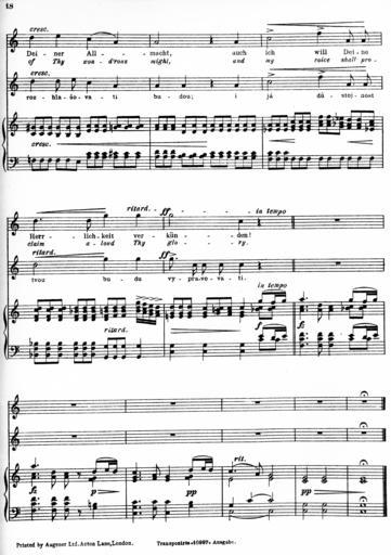 | Keywords: Dvorak's Biblicke Pisne i-18.jpg Dvorak's_Biblicke_Pisne_i- jpg 17 Antonín Dvořák's Biblícké Písně Biblical Songs Op 99 1884 Book 1 containing Songs 1-5 While Dvorak later orchestrated the work this the complete original piano-and-voice version While the massacre of the original music to fit the German and English is appalling it does contain the original Czech and the original music for the Czech The German and English should probably be considered only as a translation This is the first five songs out of ten the other five are printed in a second volume I have not yet tracked down I haven't been able to find Book 2 unfortunately 1895 copy in my own possession The only copyright claimed on the sheet music itself is to N Simrock which is a publishing house Antonín Dvořák 1841 1904 PD-Old Original Czech From http //music ibiblio org/pub/multimedia/pandora/vorbis/contrib/Marta_Chaloupka_Live/Czech notes accompanying the Pandora Music recording 1 Psalm 97 2-6 Oblak a mrákota jest vůkol Něho spravedlnost a soud základ trůnu Jeho Oheň předchází jej a zapaluje vůkol nepřátele Jeho Zasvěcujíť se po okršlku světa blýskání Jeho; to vidouc země děsí se Hory jako vosk rozplývají se před obličejem Hospodina panovníka vší země a slávu jeho spatřují všichni národové 2 Psalms 119 114-117 119 120 Skrýše má a pavéza má Ty jsi na slovo Tvé očekávám Odstuptež ode mne nešlechetníci abych ostříhal přikázaní Boha svého Posiluj mne bych zachován byl a patřil k ustanovením Tvým ustavičně Děsí se strachem před Tebou tělo mé; nebo soudů Tvých bojím se náramně 3 Psams 55 1 2 4/5 6 7 8 Slyš ó Bože Slyš modlitbu mou a neskrývej se před prosbou mou Pozoruj a vyslyš mne neboť naříkám v úpění svém a kormoutím se Srdce mé tesklí ve mně a strachové smrti přišli na mne a hrůza přikvačila mne I řekl jsem Ó bych měl křídla jako holubice zaletěl bych a poodpočinul Aj daleko bych se vzdálil a přebýval bych na poušti Pospíšil bych ujíti větru prudkému a vichřici 4 Psalms 23 1-4 Hospodin jest můj pastýř nebudu míti nedostatku Na pastvách zelených pase mne k vodám tichým mne přivodí Duši mou občerstvuje vodí mne po stezkách spravedlnosti pro jméno své Byť mi se dostalo jíti přes údolí stínu smrti nebuduť se báti zlého nebo Ty se mnou jsi; a prut Tvůj a hůl Tvá toť mne potěšuje 5 Psalms 144 9 145 1-3 5 6 Bože Bože píseň novou zpívati budu Tobě na loutně a žalmy tobě prozpěvovati Na každý den dobrořečiti budu Tobě a chváliti jméno Tvé na věky věků Hospodin jistě veliký jest a vší chvály hodný a velikost jeho nemůž vystižena býti O slávě a kráse a velebnosti Tvé i o věcech Tvých předivných mluviti budu A moc přehrozných skutků Tvých vsichni rozhlašovati budou; i já důstojnost Tvou budu vypravovati 6 Psalms 61 1 3 4 63 1 4/5 Slyš ó Bože volání mé pozoruj modlitby mé Nebo jsi býval útočiště mé a pevná věže před tváří nepřítele Buduť bydliti v stánku tvém na věky schráním se v skrýši křídel tvých Bože Bůh silný můj ty jsi tebeť hned v jitře hledám Tebe žízní duše má po tobě touží tělo mé v zemi žíznivé a vyprahlé v níž není vody A tak abych tobě dobrořečil a s radostným rtů prozpěvováním chválila by tě ústa má 7 Psalms 137 1-5 Při řekách Babylonských tam jsme sedávali a plakávali rozpomínajíce se na Sion Na vrbí v té zemi zavěšovali jsme citary své když se tam dotazovali nás ti kteříž nás zajali na slova písničky říkajíce Zpívejte nám některou píseň Sionskou Odpovídali jsme Kterakž bychom mohli zpívati píseň Hospodinovu v zemi cizozemců Jestliže se zapomenu na tebe ó Jeruzaléme ó zapomeniž i pravice má umění svého 8 Psalms 25 16-18 20 Popatřiž na mne a smiluj se nade mnou neboť jsem opuštěný a strápený Soužení srdce mého rozmnožují se z úzkostí mých vyveď mne z úzkostí mých vyveď mne Smiluj se nade mnou Viz trápení mé a bídu mou a odpusť všecky hříchy mé Ostříhej duše mé a vytrhni mne ať nejsem zahanben neboť v tebe doufám neboť v tebe doufám 9 Psalms 121 1-4 Pozdvihuji očí svých k horám odkud by mi přišla pomoc Pomoc má jest od Hospodina kterýž učinil nebe i zemi Nedopustíť aby se pohnouti měla noha tvá nebo nedřímeť strážný tvůj Aj nedřímeť ovšem nespí ten kterýž ostříhá Izraele 10 Psalms 98 1 4/5 7 8 96 12/11 Zpívejte Hospodinu píseň novou neboť jest divné věci učinil Zvuk vydejte prozpěvujte a žalmy zpívejte Zvuč moře i to což v něm jest okršlek světa i ti což na něm bydlí Řeky rukama plésejte spolu s nimi i hory prozpěvujte Plésej pole a vše což na něm plésej země zvuč i moře i což v něm jest Biblické písně Psalm 144 |