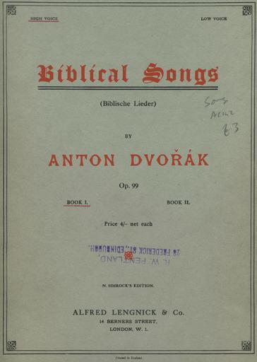 | Keywords: Dvorak's Biblicke Pisne i-1.jpg Dvorak's_Biblicke_Pisne_i- jpg 2 Antonín Dvořák's Biblícké Písně Biblical Songs Op 99 1894 Book 1 containing Songs 1-5 While Dvorak later orchestrated the work this the complete original piano-and-voice version While the massacre of the original music to fit the German and English is appalling it does contain the original Czech and the original music for the Czech The German and English should probably be considered only as a translation This is the first five songs out of ten the other five are printed in a second volume I have not yet tracked down I haven't been able to find Book 2 unfortunately 1895 copy in my own possession The only copyright claimed on the sheet music itself is to N Simrock which is a publishing house Antonín Dvořák 1841 1904 PD-Old Original Czech From http //music ibiblio org/pub/multimedia/pandora/vorbis/contrib/Marta_Chaloupka_Live/Czech notes accompanying the Pandora Music recording 1 Psalm 97 2-6 Oblak a mrákota jest vůkol Něho spravedlnost a soud základ trůnu Jeho Oheň předchází jej a zapaluje vůkol nepřátele Jeho Zasvěcujíť se po okršlku světa blýskání Jeho; to vidouc země děsí se Hory jako vosk rozplývají se před obličejem Hospodina panovníka vší země a slávu jeho spatřují všichni národové 2 Psalms 119 114-117 119 120 Skrýše má a pavéza má Ty jsi na slovo Tvé očekávám Odstuptež ode mne nešlechetníci abych ostříhal přikázaní Boha svého Posiluj mne bych zachován byl a patřil k ustanovením Tvým ustavičně Děsí se strachem před Tebou tělo mé; nebo soudů Tvých bojím se náramně 3 Psams 55 1 2 4/5 6 7 8 Slyš ó Bože Slyš modlitbu mou a neskrývej se před prosbou mou Pozoruj a vyslyš mne neboť naříkám v úpění svém a kormoutím se Srdce mé tesklí ve mně a strachové smrti přišli na mne a hrůza přikvačila mne I řekl jsem Ó bych měl křídla jako holubice zaletěl bych a poodpočinul Aj daleko bych se vzdálil a přebýval bych na poušti Pospíšil bych ujíti větru prudkému a vichřici 4 Psalms 23 1-4 Hospodin jest můj pastýř nebudu míti nedostatku Na pastvách zelených pase mne k vodám tichým mne přivodí Duši mou občerstvuje vodí mne po stezkách spravedlnosti pro jméno své Byť mi se dostalo jíti přes údolí stínu smrti nebuduť se báti zlého nebo Ty se mnou jsi; a prut Tvůj a hůl Tvá toť mne potěšuje 5 Psalms 144 9 145 1-3 5 6 Bože Bože píseň novou zpívati budu Tobě na loutně a žalmy tobě prozpěvovati Na každý den dobrořečiti budu Tobě a chváliti jméno Tvé na věky věků Hospodin jistě veliký jest a vší chvály hodný a velikost jeho nemůž vystižena býti O slávě a kráse a velebnosti Tvé i o věcech Tvých předivných mluviti budu A moc přehrozných skutků Tvých vsichni rozhlašovati budou; i já důstojnost Tvou budu vypravovati 6 Psalms 61 1 3 4 63 1 4/5 Slyš ó Bože volání mé pozoruj modlitby mé Nebo jsi býval útočiště mé a pevná věže před tváří nepřítele Buduť bydliti v stánku tvém na věky schráním se v skrýši křídel tvých Bože Bůh silný můj ty jsi tebeť hned v jitře hledám Tebe žízní duše má po tobě touží tělo mé v zemi žíznivé a vyprahlé v níž není vody A tak abych tobě dobrořečil a s radostným rtů prozpěvováním chválila by tě ústa má 7 Psalms 137 1-5 Při řekách Babylonských tam jsme sedávali a plakávali rozpomínajíce se na Sion Na vrbí v té zemi zavěšovali jsme citary své když se tam dotazovali nás ti kteříž nás zajali na slova písničky říkajíce Zpívejte nám některou píseň Sionskou Odpovídali jsme Kterakž bychom mohli zpívati píseň Hospodinovu v zemi cizozemců Jestliže se zapomenu na tebe ó Jeruzaléme ó zapomeniž i pravice má umění svého 8 Psalms 25 16-18 20 Popatřiž na mne a smiluj se nade mnou neboť jsem opuštěný a strápený Soužení srdce mého rozmnožují se z úzkostí mých vyveď mne z úzkostí mých vyveď mne Smiluj se nade mnou Viz trápení mé a bídu mou a odpusť všecky hříchy mé Ostříhej duše mé a vytrhni mne ať nejsem zahanben neboť v tebe doufám neboť v tebe doufám 9 Psalms 121 1-4 Pozdvihuji očí svých k horám odkud by mi přišla pomoc Pomoc má jest od Hospodina kterýž učinil nebe i zemi Nedopustíť aby se pohnouti měla noha tvá nebo nedřímeť strážný tvůj Aj nedřímeť ovšem nespí ten kterýž ostříhá Izraele 10 Psalms 98 1 4/5 7 8 96 12/11 Zpívejte Hospodinu píseň novou neboť jest divné věci učinil Zvuk vydejte prozpěvujte a žalmy zpívejte Zvuč moře i to což v něm jest okršlek světa i ti což na něm bydlí Řeky rukama plésejte spolu s nimi i hory prozpěvujte Plésej pole a vše což na něm plésej země zvuč i moře i což v něm jest Biblické písně Biblické písně 1894 Christianity in the Czech Republic Czech language |