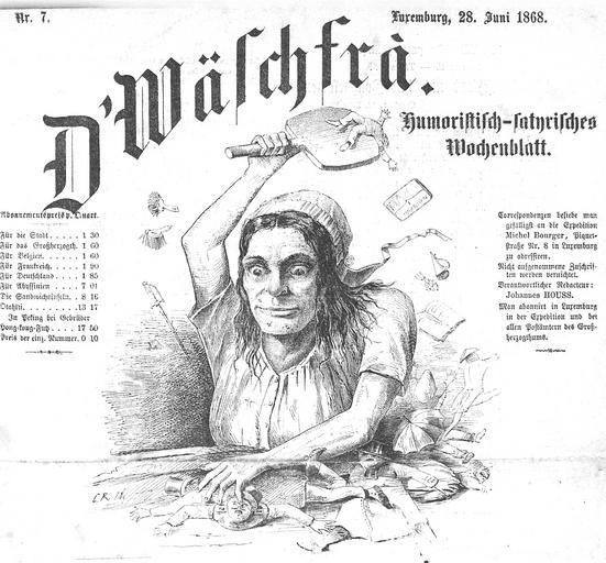 | Keywords: D'Wäschfra 1868-06-28 p1.jpg lb Entête vun der Zäitschrëft D'Wäschfra Humoristisch-satyrisches Wochenblatt zënter der Nummer 6 hei déi vum vum 28 Juni 1868 1868-06-28 http //www eluxemburgensia lu/R func file file_name titleinfo coll 5 eluxemburgensia lu Numérisé par la Bibliothèque nationale de Luxembourg C R ; Johann Houss editor PD-art PD-old-auto Luxembourg 1868 Uploaded with UploadWizard D'Wäschfra 1868 Luxembourg in the 1860s | ||||