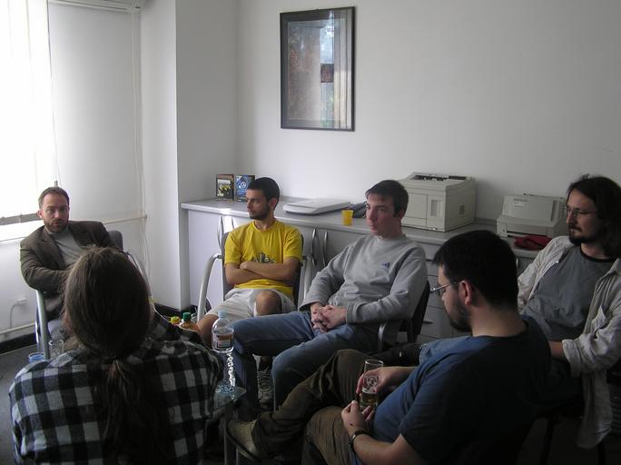 | Keywords: Dzimbo u Beogradu 16.jpeg Слика неколицине која је била у РАСТКУ када је Jimbo Wales дошао у посету у БГ Transferred from http //sr wikipedia org sr wikipedia; transferred to Commons by User Кале using http //tools wikimedia de/~magnus/commonshelper php CommonsHelper 2005-05-17 Original uploader was Dungodung at http //sr wikipedia org sr wikipedia Released into the public domain by the author sr wikipedia Dungodung Original upload log page sr wikipedia Dzimbo_u_Beogradu_16 jpeg 2005-05-17 10 17 Dungodung 22881712 814544 bytes <nowiki>Слика неколицине која је била у РАСТКУ када је Jimbo Wales дошао у посету у БГ </nowiki> Wikimedian meetups in Serbia 2005 |