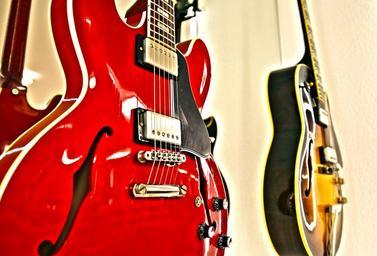 Keywords: e guitar gibson lespauls guitar music instrument electrically strings red soundbody golden yellow close