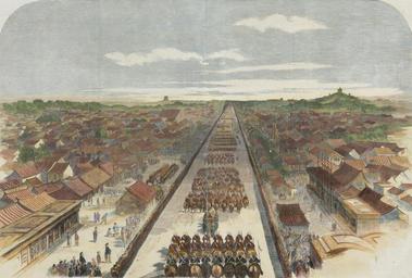 Keywords: Earl of Elgin's entrance into Peking.jpg The Earl of Elgin's entrance into Peking on 24 October 1860 to sign the treaty of peace between Great Britain and China Elgin entered Peking in a sedan chair accompanied by a hundred cavalry and 400 infantry 1860 http //nla gov au/nla cat-vn6808783 The Illustrated London News 5 January 1861 pp 20 “21 Sketched by our special artist from the An-Tin Gate Gate of Peace of the Tartar Quarter PD-old-100-1923 James Bruce 8th Earl of Elgin Second Opium War |