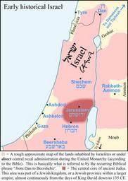 MAKE A MEME View Large Image Early-Historical-Israel-Dan-Beersheba-Judea.png In this graphic about early historical Israel the pink area is a rough approximate map of the near-maximum boundaries of the lands that were inhabited by Israelites or under direct central ...