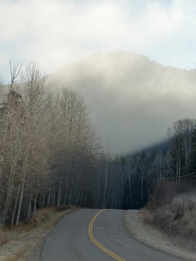 Keywords: early morning sunrise clouds canim lake british columbia canada scenery weather beautiful nature mood outdoor morning glory countryside landscape fog first frost autumn fog bank paved road