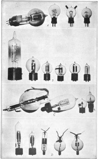 | Keywords: Early triode vacuum tubes.jpg triode vacuum tubes from around 1918 all derived from the Audion tube invented by Lee De Forest in 1906 The recognition of the Audion's ability to amplify signals around 1912 caused its rapid development by several organizations Bottom row D Audions made by De Forest's company 3rd row C General Electric tubes invented by Irving Langmuir called Pliotrons 2nd row B Tubes developed by Western Electric Bell Telephone Co who bought the Audion rights from De Forest; these were used in the first telephone line repeaters which made the first transcontinental telephone service possible in 1915 Top row A French tubes De Forest let his French patent rights to the Audion lapse in 1912 through lack of a 125 filing fee and the French government manufactured hundreds of thousands of these tubes during World War 1 <br /><br /> The triode consists of an evacuated glass bulb with three electrodes inside a heated filament a control grid consisting of a screen of wires and a metal plate The American tubes B C and D were all constructed with a filament in the center with the grid consisting of two flat screens on either side and the plate consisting of two flat metal plates outside that The French tubes A had a horizontal filament wire surrounded by a grid consisting of a helix of wire surrounded by a concentric plate consisting of a metal cylinder The smaller tubes on the right of each row were used in radio receivers while the larger tubes to the left were higher power types used in transmitters before 1918 Downloaded July 22 2013 from http //books google com/books id KpZEAAAAIAAJ pg PA321 The Principles Underlying Radio Communication National Bureau of Standards radio pamphlet no 40 US Signal Corps December 10 1918 US Government Printing Office p 321 fig 250 on Google Books author PD-USGov ImageNote 1 430 1393 518 345 1080 1756 2 Low power De Forest Audions for receiving ImageNoteEnd 1 ImageNote 2 129 1317 304 421 1080 1756 2 High power Audions which De Forest called Oscillions for transmitters ImageNoteEnd 2 ImageNote 3 831 1004 246 272 1080 1756 2 Low power pliotrons for receiving designed by Irving Langmuir at General Electric ImageNoteEnd 3 ImageNote 4 29 937 802 345 1080 1756 2 High power pliotrons for transmitting designed by Irving Langmuir at General Electric ImageNoteEnd 4 ImageNote 5 451 661 585 263 1080 1756 2 Low power triodes for receivers made by AT T Western Electric ImageNoteEnd 5 ImageNote 6 56 322 401 594 1080 1756 2 High power triodes for transmitters made by AT T Western Electric ImageNoteEnd 6 ImageNote 7 50 18 995 299 1080 1756 2 French triodes ImageNoteEnd 7 Uploaded with UploadWizard Vacuum triodes Early vacuum triodes Audion French triode Loupiote Western Electric vacuum tubes General Electric Pliotrons General Electric vacuum tubes De Forrest Audion |