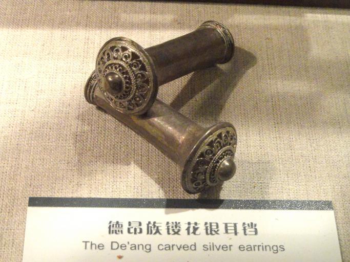 | Keywords: Earrings - Yunnan Nationalities Museum - DSC04161.JPG De'ang silver earrings Jewelry in the Yunnan Nationalities Museum Kunming Yunnan China I took this photograph 2011-08-13 01 55 59 Daderot Public domain Jewellery in the Yunnan Nationalities Museum De'ang jewelry |
