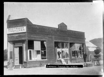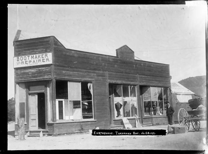 Keywords: blackandwhite monochrome photo border building architecture black and white G J Pepper's bootmaking shop, and premises of J D Kelley, artist, at Tokomaru Bay, after an earthquake. Between these two shops is another unidentifiable shop (window too damaged to make out signage). Shows a one storied, wooden building, on a site on the corner of a street, with broken windows. An unidentified man stands alongside. Photograph possibly taken by Oates Bros of Tokomaru Bay between 1900-1930. Inscriptions: Inscribed - Photographer's title on negative -bottom centre: Earthquake. Tokomaru Bay No O.B. 199. Quantity: 1 b&w original negative(s). Physical Description: Dry plate glass negative 4.75 x 6.5 inches Earthquake damaged bootmaker's shop and artist's premises at Tokomaru Bay. Price, William Archer, 1866-1948 :Collection of post card negatives. Ref: 1/2-001261-G. Alexander Turnbull Library, Wellington, New Zealand. natlib.govt.nz/records/23215511 G J Pepper's bootmaking shop, and premises of J D Kelley, artist, at Tokomaru Bay, after an earthquake. Between these two shops is another unidentifiable shop (window too damaged to make out signage). Shows a one storied, wooden building, on a site on the corner of a street, with broken windows. An unidentified man stands alongside. Photograph possibly taken by Oates Bros of Tokomaru Bay between 1900-1930. Inscriptions: Inscribed - Photographer's title on negative -bottom centre: Earthquake. Tokomaru Bay No O.B. 199. Quantity: 1 b&w original negative(s). Physical Description: Dry plate glass negative 4.75 x 6.5 inches Earthquake damaged bootmaker's shop and artist's premises at Tokomaru Bay. Price, William Archer, 1866-1948 :Collection of post card negatives. Ref: 1/2-001261-G. Alexander Turnbull Library, Wellington, New Zealand. natlib.govt.nz/records/23215511 |