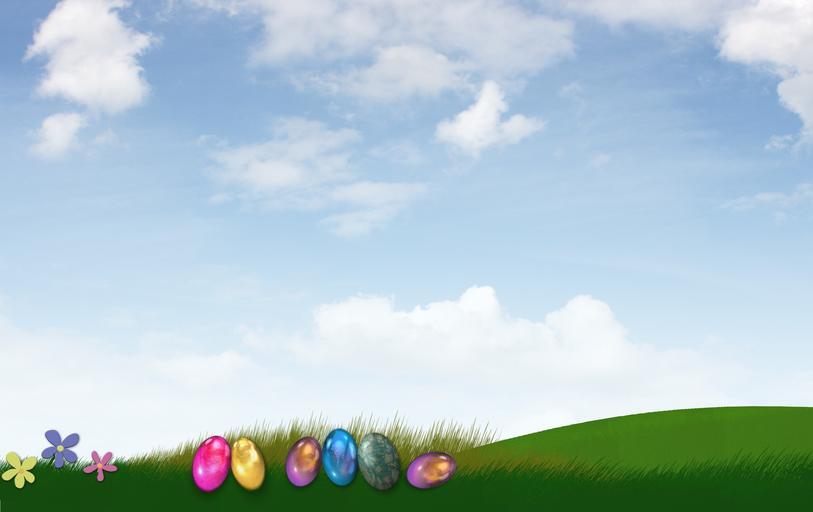 Keywords: easter easter eggs background meadow color colorful flowers grass sky clouds greeting card