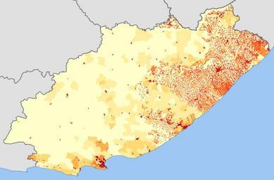 | Keywords: Eastern Cape 2011 population density map.svg ffffcc <1 inhabitant/km² ffeda0 1 “3 inhabitants/km² fed976 3 “10 inhabitants/km² feb24c 10 “30 inhabitants/km² fd8d3c 30 “100 inhabitants/km² fc4e2a 100 “300 inhabitants/km² e31a1c 300 “1000 inhabitants/km² bc0026 1000 “3000 inhabitants/km² 800026 >3000 inhabitants/km² Projection is Albers Equal-Area Conic with standard parallels at 25 5° S and 31 5° S and origin at 28 5° S 25 5° E Statistics South Africa's Census 2011 is the source of the basic population data The map results from my own processing of the data Htonl 2013-10-22 http //beta2 statssa gov za/ page_id 425 The following license applies to the population data on which the map is based the user acknowledges Stats SA as the source of the basic data wherever they process apply utilise publish or distribute the data and also that they specify that the relevant application and analysis where applicable result from their own processing of the data The following tag applies to the map itself Demographic maps of South Africa Maps of the Eastern Cape |