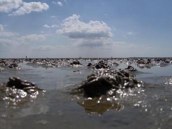 Keywords: ebb wadden sea watt bottom sea national park north sea clouds sky blue world natural heritage mudflat hiking mecklenburg lugworm shit intertidal zone low tide sand watt watt worm pile