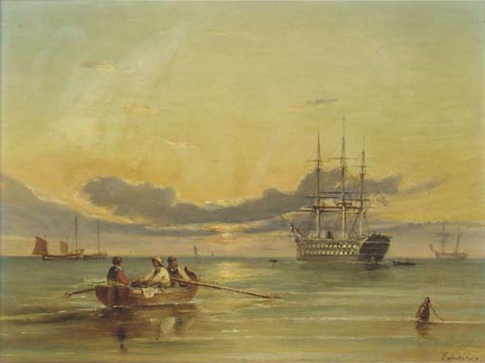 | Keywords: Ebenezer Colls - A screw two-decker lying at anchor at dusk.jpg oil panel cm 17 8 22 9 object history credit line E Colls ~ lower right signature accession number Christie's online 4287055 PD-old-auto-1923 1887 Ebenezer Colls 19th-century sailing ships in paintings Paintings of seascapes with sunset |