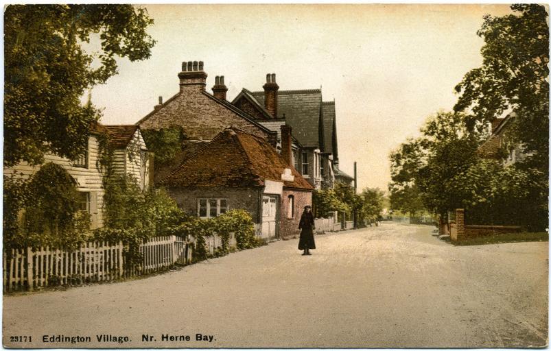 | Keywords: Eddington Canterbury Road 1908.jpg Tinted postcard of Eddington Herne Bay Kent England Postmarked Herne Bay Au 10 08 The picture shows the original village or hamlet long before the area became a suburb of Herne Bay Publisher Photochrom Co Ltd London Most of the buildings in the photo still exist The site is on the east side of the Canterbury Road A299 looking north just north of Priory House at the southern end of Eddington Points of interest The house in the foreground is in the Kentish vernacular style with limewashed weatherboarding but the taller houses are late Victorian There is no footpath The orange-red roofs of the buildings in the foreground are pan-tiled Among the green-tinted bushes just above the white picket fence of the weatherboarded house there is possibly a figure in the garden which has been obliterated by the green added colouring It is just to the left of the open white picket gate The dark figure in the middle of the road may have been sketched in The low building with double doors and tall chimney in the centre of the picture may have been the forge which is recorded at this crossroads Also recorded here is the guidepost or signpost which can just be seen on the left side of the road in the distance Standing out in the distance on the left side of the road is a tall chimney which may be the sewer vent column which is a listed building Scan of original postcard in my possession 1908 anon out of copyright PD-old-70-1923 Historical images of Eddington Kent Postcards of Kent 1900s postcards Clapboards building material |