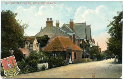 | Keywords: Eddington Kent 1907 002.jpg Tinted postcard of Eddington Herne Bay Kent England Postmarked Herne Bay Au 2 07 The picture shows the original village or hamlet long before the area became a suburb of Herne Bay Publisher Milton's Gazette series Most of the buildings in the photo still exist The site is on the east side of the Canterbury Road A299 just north of Priory House at the southern end of Eddington Points of interest The house in the foreground is in the Kentish vernacular style with limewashed weatherboarding but the taller houses are late Victorian There is no footpath There is a working woman in white apron in a doorway a woman standing in the street and a person in the garden behind the white picket gate Further along the street is a cart Note the striped yellow window blinds on the Victorian house The orange-red roofs of the buildings in the foreground are pan-tiled The site is the Canterbury Road looking north Scan of original postcard in my possession 1907 anon out of copyright PD-old-70-1923 Historical images of Eddington Kent Postcards of Kent 1900s postcards |