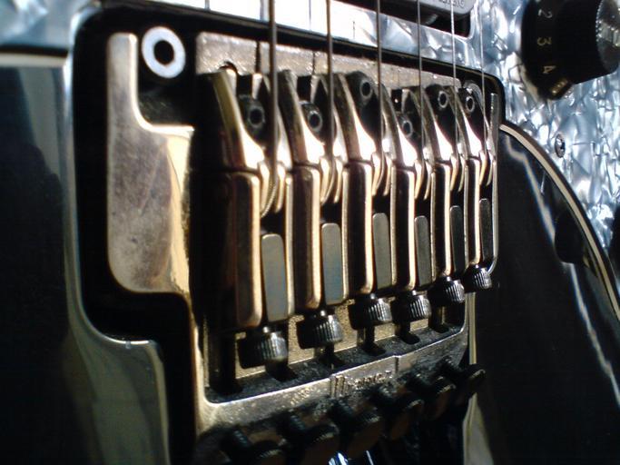 Keywords: EdgePro2Bridge.jpg Edge Pro II tremolo from a 2003 Ibanez JEM 555 BK electric guitar Own 2008-02-17 Rodrigo César Ibanez JEM Floyd Rose