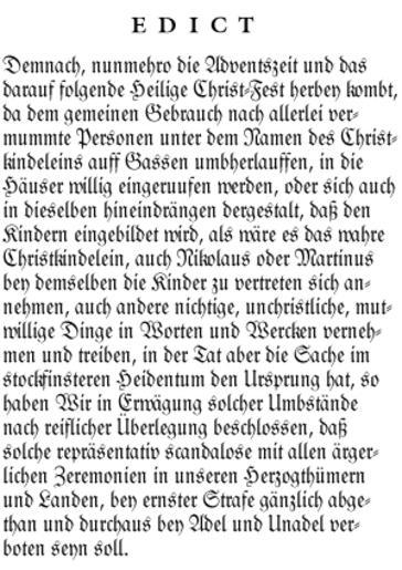 Keywords: Edikt Gustav-Adolf von Mecklenburg-Güstrow.gif Gustav Adolf vom 28 November 1682 Ingeborg Weber-Kellermann Das Weihnachtsfest - Eine Kultur und Sozialgeschichte der Weihnachtszeit Luzern u Frankfurt/M 1978 1682 Gustav Adolf Mecklenburg-Güstrow ;Text EDICT Demnach nunmehro die Adventszeit und das darauf folgende Heilige Christ-Fest herbey kombt da dem gemeinen Gebrauch nach allerlei vermummte Personen unter dem Namen des Christkindeleins auff Gassen umbherlauffen in die Häuser willig eingeruufen werden oder sich auch in dieselben hineindrängen dergestalt daß den Kindern eingebildet wird als wäre es das wahre Christkindelein auch Nikolaus oder Martinus bey demselben die Kinder zu vertreten sich annehmen auch andere nichtige unchristliche mutwillige Dinge in Worten und Wercken vernehmen und treiben in der Tat aber die Sache im stockfinsteren Heidentum den Ursprung hat so haben Wir in Erwägung solcher Umbstände nach reiflicher à berlegung beschlossen daß solche repräsentativ scandalose mit allen ärgerlichen Zeremonien in unseren Herzogthümern und Landen bey ernster Strafe gänzlich abgethan und durchaus bey Adel und Unadel verboten seyn soll PD-old-100 Original upload log page de wikipedia Edikt_Gustav-Adolf_von_Mecklenburg-G C3 BCstrow gif 2008-03-11 00 54 Fifat 300×425× 24351 bytes <nowiki> Information Edikt des Herzogs Gustav Adolf Mecklenburg-Güstrow vom 28 November 1682 Ingeborg Weber-Kellermann Das Weihnachtsfest - Eine Kultur und Sozialgeschichte der Weihnachtszeit Luzern u Frankfurt/M 1978 Urheb</nowiki> Documents associated with Mecklenburg Advent History of Mecklenburg Mecklenburg-Vorpommern in the 1680s |