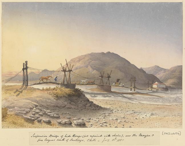 | Keywords: Edward Gennys Fanshawe, Suspension Bridge of hide thongs (but repaired with chain) over the Maypu, five leagues south of Santiago, Chile, Jany 11th 1851.jpg en 'Suspension Bridge of hide thongs but repaired with chain over the Maypu five leagues south of Santiago Chile Jany 11th 1851' http //collections rmg co uk/collections/objects/154594 html 1851-01-11 Admiral Edward Fanshawe Edward Gennys Fanshawe 1814 11 27 1906 10 21 PD-Art-100 Edward Gennys Fanshawe 1851 watercolor paintings Landscape paintings of Chile Chile in the 1850s MaipĂș Paintings in the National Maritime Museum London Watercolor paintings of landscapes Bridges in art Suspension bridges in Chile |