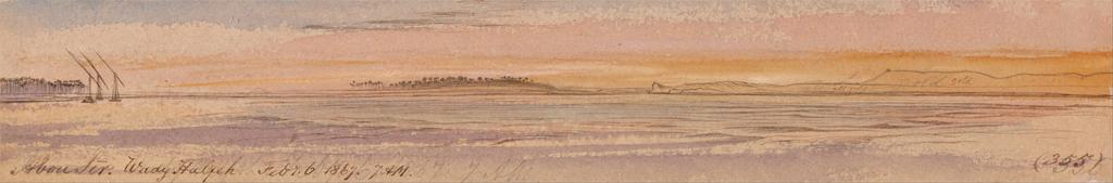 | Keywords: Edward Lear - Abu Seer, Wady Halfeh - Google Art Project.jpg inscribed in brown ink lower left; Aboustir Wady Halfeh Feby 6 1967 7 AM ; in brown ink lower right 355 ; Verso in graphite left center 99 up Top ; in graphite upper center 216 Not on View Watercolor with pen in brown ink over graphite on moderately thick moderately textured beige wove paper sky water lake river riverbank landscape boats special url_id YQHJOW7in6YFHg PD-old-100-1923 1888 Egypt by Edward Lear Abusir Wadi Halfa Nubia in art Google Art Project works by Edward Lear |