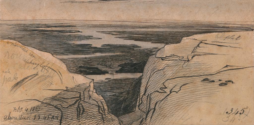 Keywords: Edward Lear - Abu Seer - Google Art Project (2434003).jpg inscribed in black ink lower left Feby 4 1867 abou Seer 11 45 AM; in black ink lower right 3450 ; Verso in graphite upper left 90 up ; in graphite center next below top left Not on View Watercolor with pen in black ink over graphite on moderately thick slightly textured beige wove paper water cliffs landscape special url_id 7gEmLzgtBw6_Pg PD-old-100-1923 1888 Egypt by Edward Lear Abusir Google Art Project works by Edward Lear