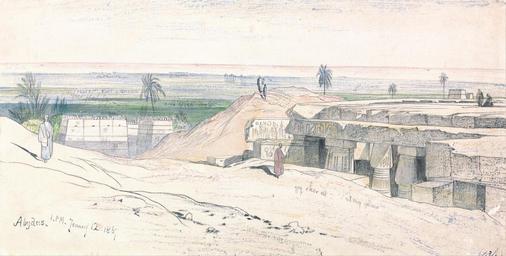 Keywords: Edward Lear - Abydos, 1-00 pm, 12 January 1867 (134) - Google Art Project.jpg inscribed in black ink lower left Abydus 1 PM January 12 1867 ; in black ink lower right 134 ; Verso in graphite upper left 30 up next above Lowest Not on View Watercolor with pen in gray and black ink over graphite on thick slightly textured cream wove paper architectural subject sky palm trees stone columns architectural elements temples ruins structures single built works figures landscape special url_id QwGeCbQRcJJjng PD-old-100-1923 1888 Egypt by Edward Lear Google Art Project works by Edward Lear Abydos 1867 |
