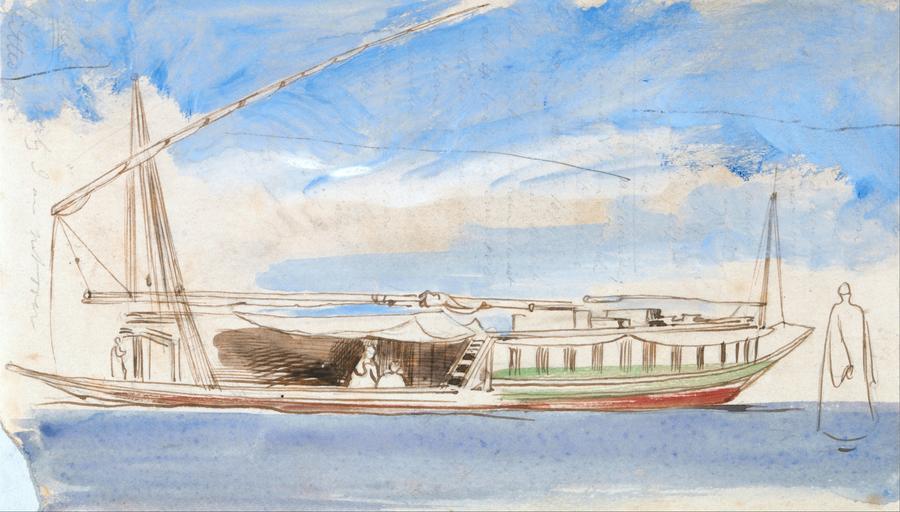 | Keywords: Edward Lear - Boat on the Nile - Google Art Project.jpg inscribed in brown red ink lower left 15 January 1854 4 1/2 P M Sea blue red sky above okr - ref West x faint dusty lilac ; in brown-red ink lower right 75 ; Verso inscribed in balck ink upper center 16 uppermost ; in graphite lower center 68 Not on View Watercolor with pen in brown ink over graphite on moderately thick rough beige wove paper sky water river riverbank structure single built work sail landscape marine art boat special url_id _gGCDRhYFYJK8w PD-old-100-1923 1888 Egypt by Edward Lear Nile in art Google Art Project works by Edward Lear 1854 in Egypt Egyptian feluccas in art |