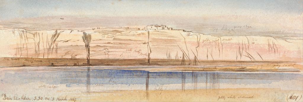 | Keywords: Edward Lear - Deir El Adra - Google Art Project.jpg inscribed in brown ink lower left Deir El Adra 5 30 PM 5 March 1867; in brown ink lower right goldy white at sunset 601 ; Verso in graphite upper left 319 161 up next below Not on View Watercolor with pen in brown ink over graphite on thick rough cream wove paper bird sky water cliffs river buildings landscape boats special url_id 8QGkDJw76Yu70A PD-old-100-1923 1888 Egypt by Edward Lear Google Art Project works by Edward Lear Deir el-Adra |