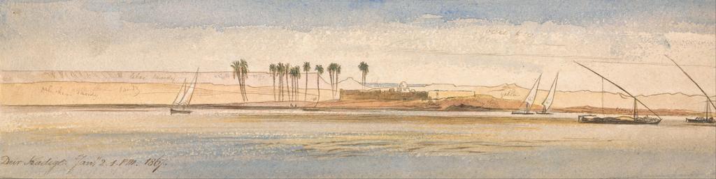 | Keywords: Edward Lear - Deir Kadige, 1-00 p.m., January 2, 1867 - Google Art Project.jpg inscribed in brown ink lower left Deir Kadige Jany 2 1 PM 1867 ; Verso in graphite upper left 5 up Lowest Not on View Watercolor with pen in brown ink over graphite on moderately thick rough beige wove paper palm trees water river sails landscape marine art boats special url_id 2QHMArOoYsTuGw PD-old-100-1923 1888 Egypt by Edward Lear Google Art Project works by Edward Lear | ||||
