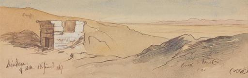 Keywords: Edward Lear - Dendera, 9-00 am, 15 January 1867 (156) - Google Art Project.jpg Inscribed in brown ink lower left Dendera 9 AM 15 Jany 1867 ; in brown ink lower right 156 ; Verso in graphite upper left 36 up ; in graphite center next above lowest Inscription _Signed_and_Dated Not signed not dated Not on View Watercolor with pen in brown ink and gouache over graphite on moderately thick slightly textured beige wove paper architectural subject sky sand temple ruins river landscape desert special url_id 5QEGFSSkrXc7Cw PD-old-100-1923 1888 Egypt by Edward Lear Dendera Google Art Project works by Edward Lear |