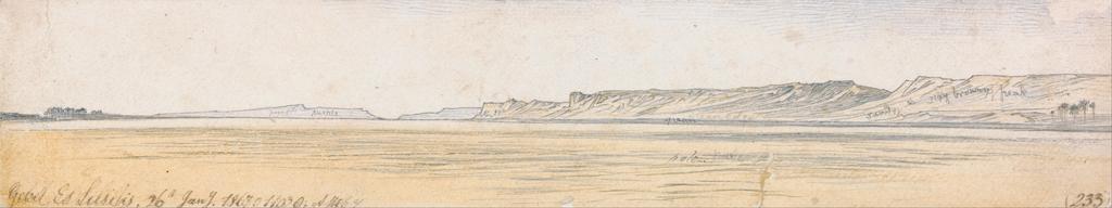 | Keywords: Edward Lear - Gebel Es Silsilis - Google Art Project (2317343).jpg inscribed in pen with brown ink over graphite; lower left Gebel Es Silsilis 26' Jany 1867 11 30 AM inscribed in pen with brown ink; lower right 235 ; Verso inscribed in graphite center 58 up next below top Mhule ; inscribed in graphite center right 165 Not on View Watercolor with pen in gray and brown ink over graphite on moderately thick slightly textured cream wove paper palm trees water river landscape special url_id QwG-Bib1SafZXw PD-old-100-1923 1888 Egypt by Edward Lear Nile in art Google Art Project works by Edward Lear Gebel el-Silsila |
